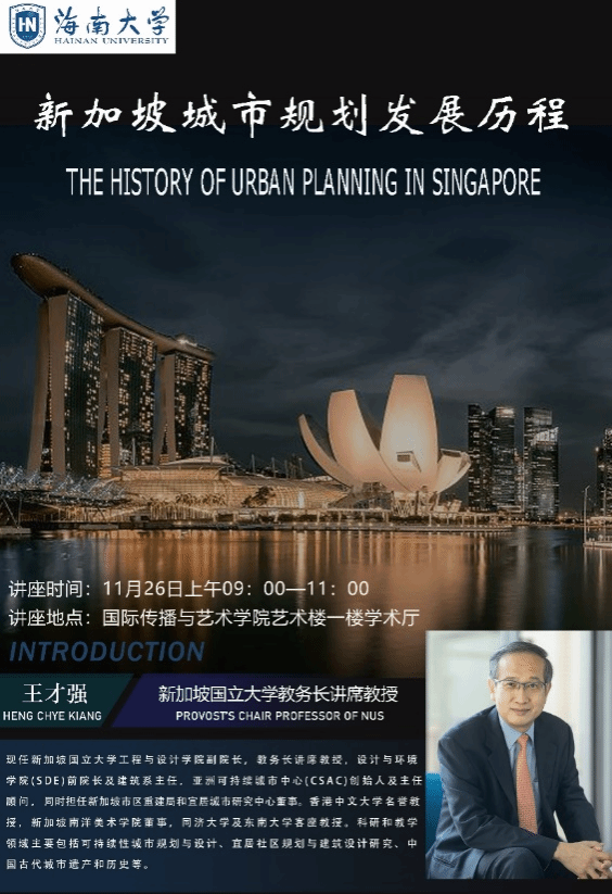 11月26日上午9:00 ,应36365线路检测中心欢迎您邀请,新加坡国立大学教务长讲席教授、新加坡南洋美术学院董事、亚洲可持续城市中心创始人及主任顾问王才强(HENG CHYE KIANG)教授,在艺术楼学术厅开展以 “新加坡城市规划发展历程”为主题的学术讲座。