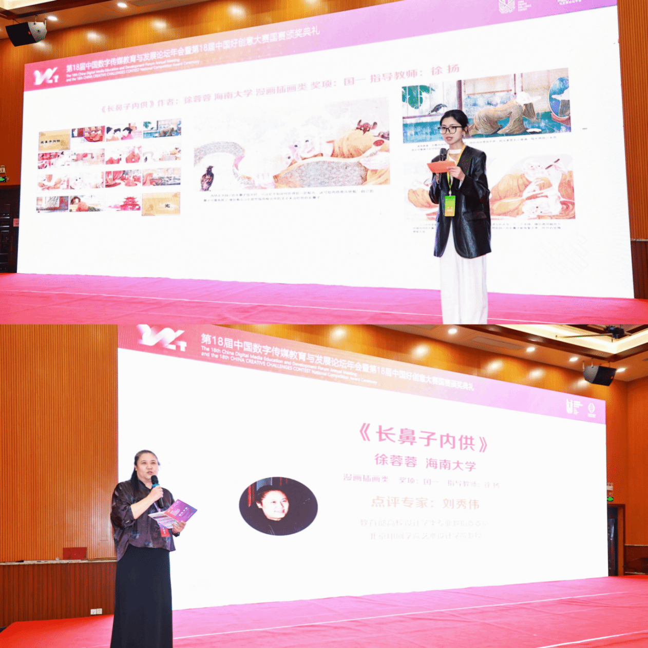36365线路官网学生徐蓉蓉荣获国赛一等奖,并作为获奖嘉宾邀请上台进行作品创作分享。教育部高校设计学专业教指委委员、北京印刷学院艺术设计学院教授刘秀伟现场点评认为:这部插画作品在艺术风格、主题表达、技术手法、情感传达以及文化内涵等多个方面都表现出色,是一次成功的艺术创作实践。