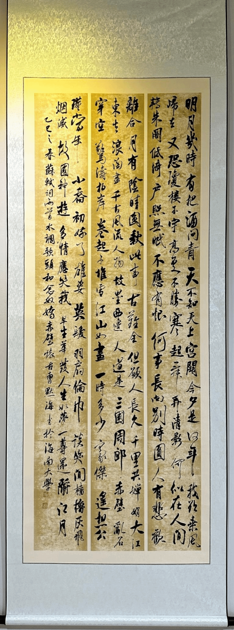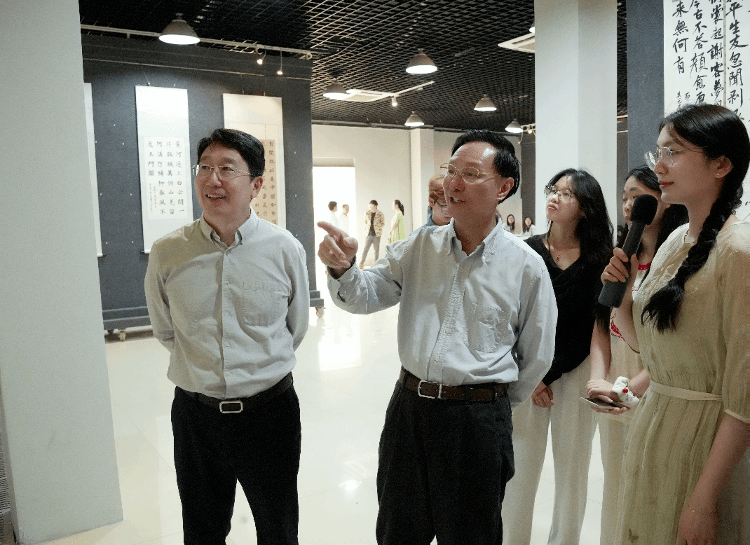 符宣国书记听取了参展师生对作品构思、技法的讲解,对学生的艺术创造力表示肯定,并强调书法学习必须扎根传统,在深入研习古代名家作品的过程中,逐步形成个人风格;同时要注重古典文学修养,多书写古诗词等传统经典内容,提升作品的文化内涵。