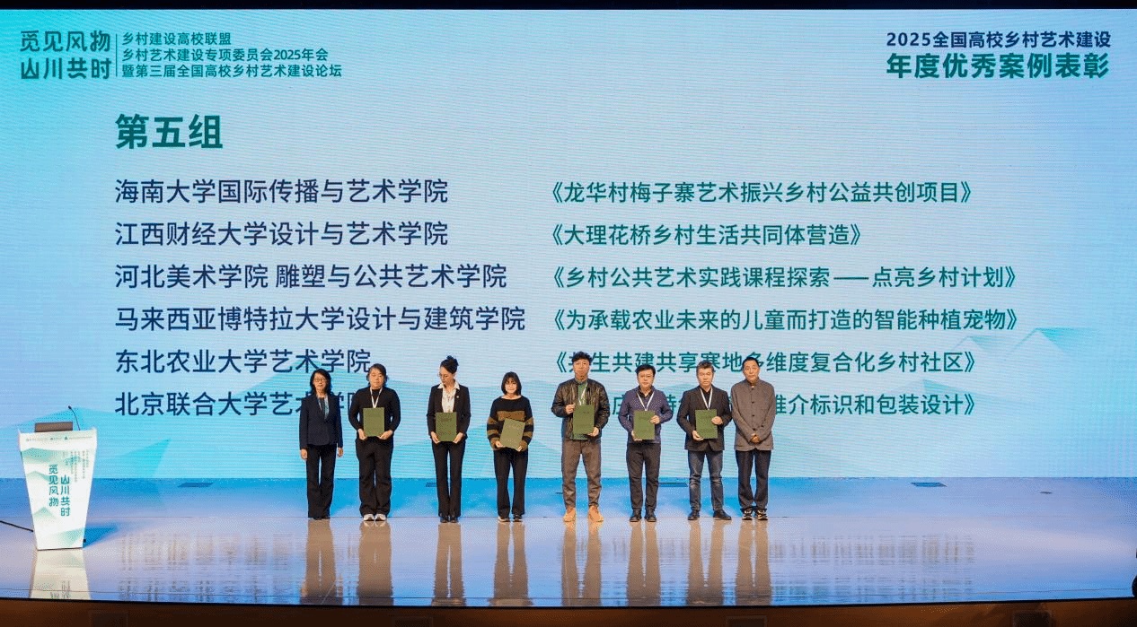 36365线路官网“海岛艺术创新研究”团队作品《龙华村梅子寨艺术振兴乡村公益共创项目》从来自60余所高校的近300件参展作品中脱颖而出,荣获“2025全国高校乡村艺术建设年度优秀案例”。该团队由包格日乐吐教授领衔,张春梅、王莉、志勇、束博等师生共同参与组建。