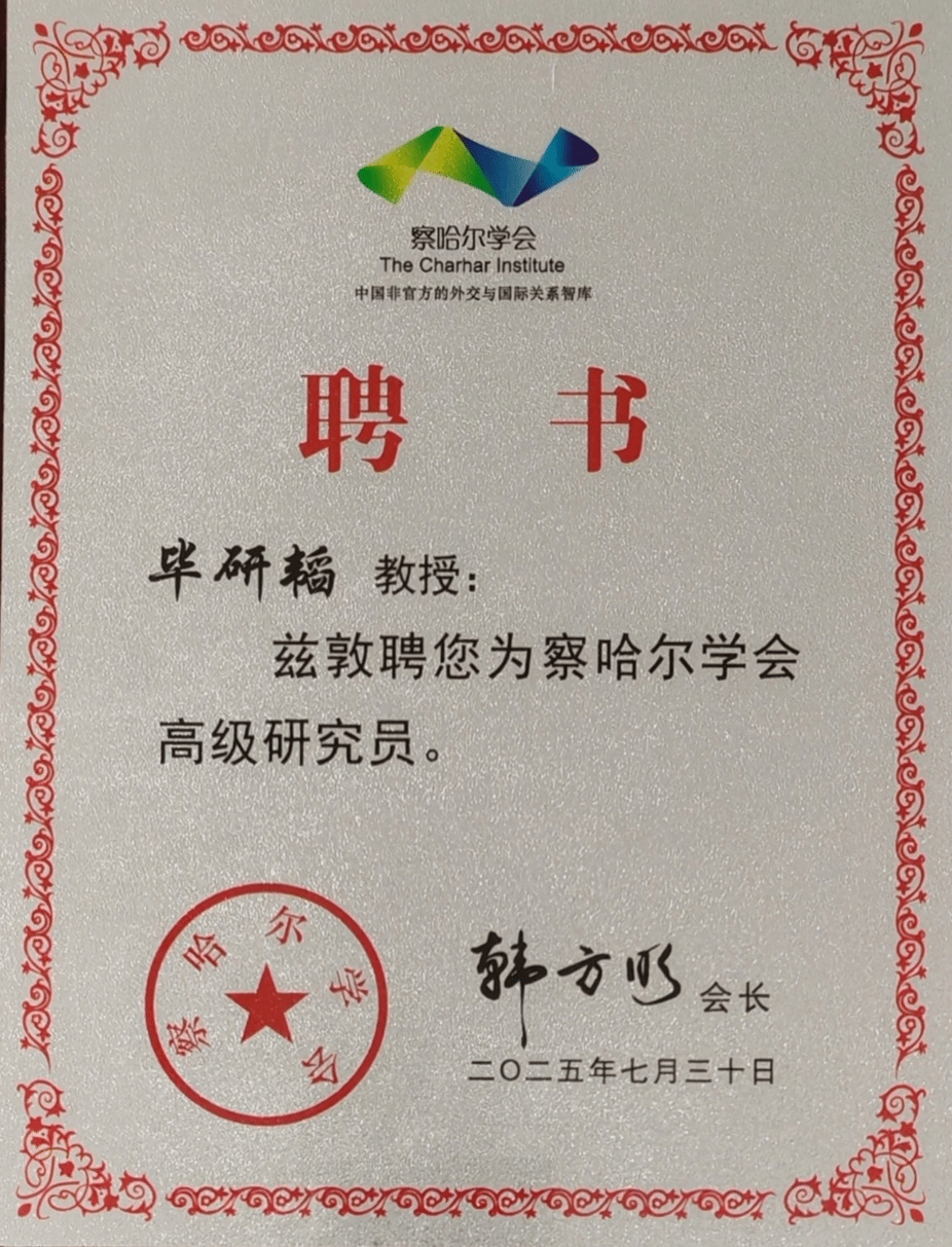 近日,36365线路官网传播学系毕研韬教授受聘为察哈尔学会高级研究员。