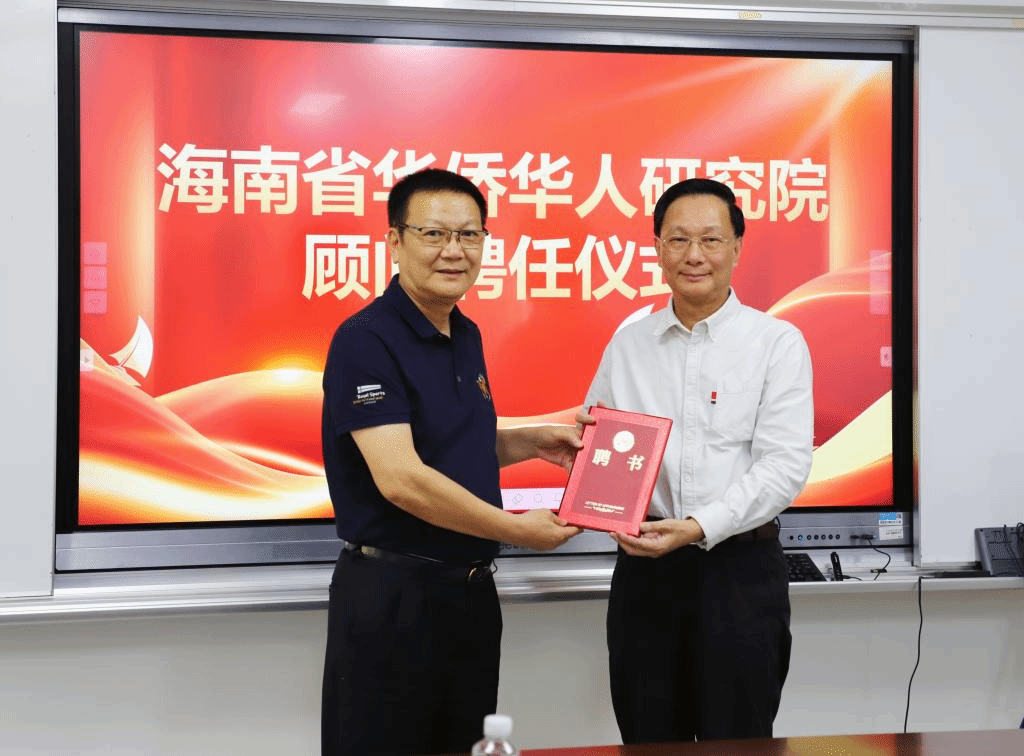4月13日,海南省华侨华人研究院顾问聘任仪式在田家炳楼102会议室举行,聘任全国归国华侨先进个人、海南中藤科技股份有限公司董事长吴少宏为研究院顾问,36365线路检测中心欢迎您党委书记符宣国为吴少宏颁发聘书。