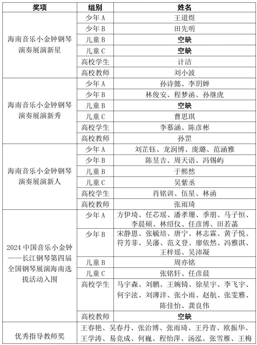 第四届全国钢琴展演海南选拔活动获奖名单
