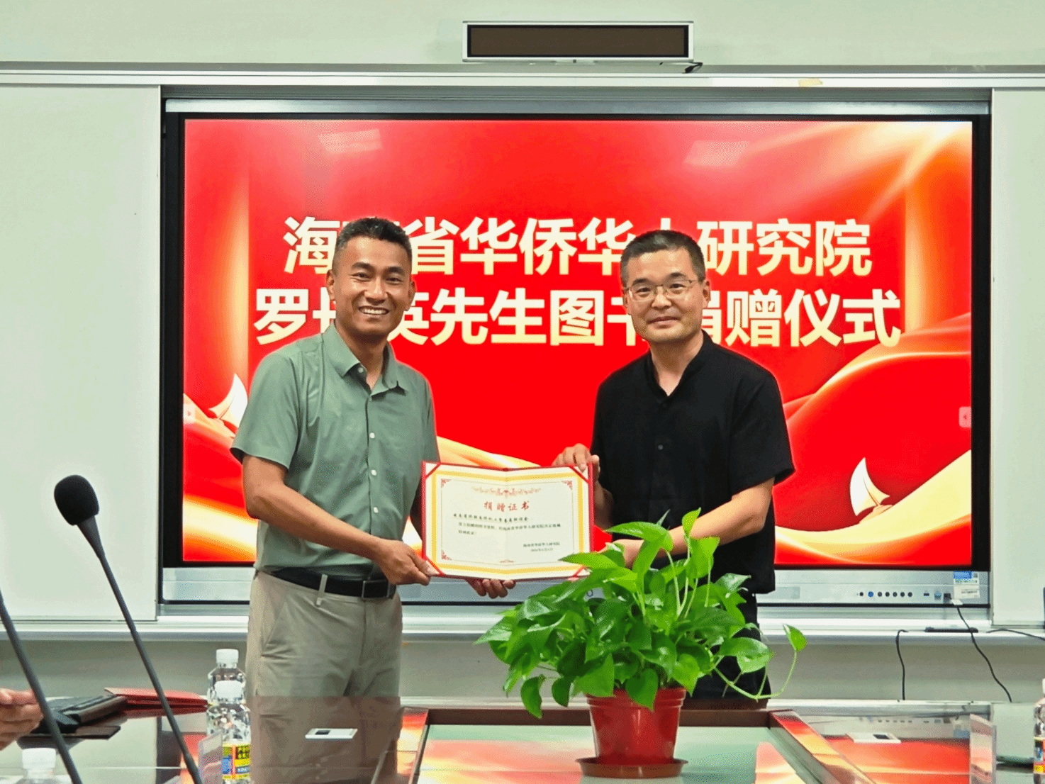 6月4日,海南省华侨华人研究院在田家炳楼举行罗长英先生图书捐赠仪式。研究院秘书长安华涛接受图书捐赠,并向罗长英先生、云南省侨联南侨机工暨眷属联谊会颁发了图书收藏证书。海口市侨联专职副主席苏先智、海口市南侨机工眷属联谊会会长罗长英、海口市南侨机工眷属联谊会理事陈良维、海口市南侨机工眷属联谊会理事罗章信、36365线路检测中心欢迎您海德书院党委书记韩胜丁出席活动,36365线路检测中心欢迎您副教授孔泽鸣主持仪式。
