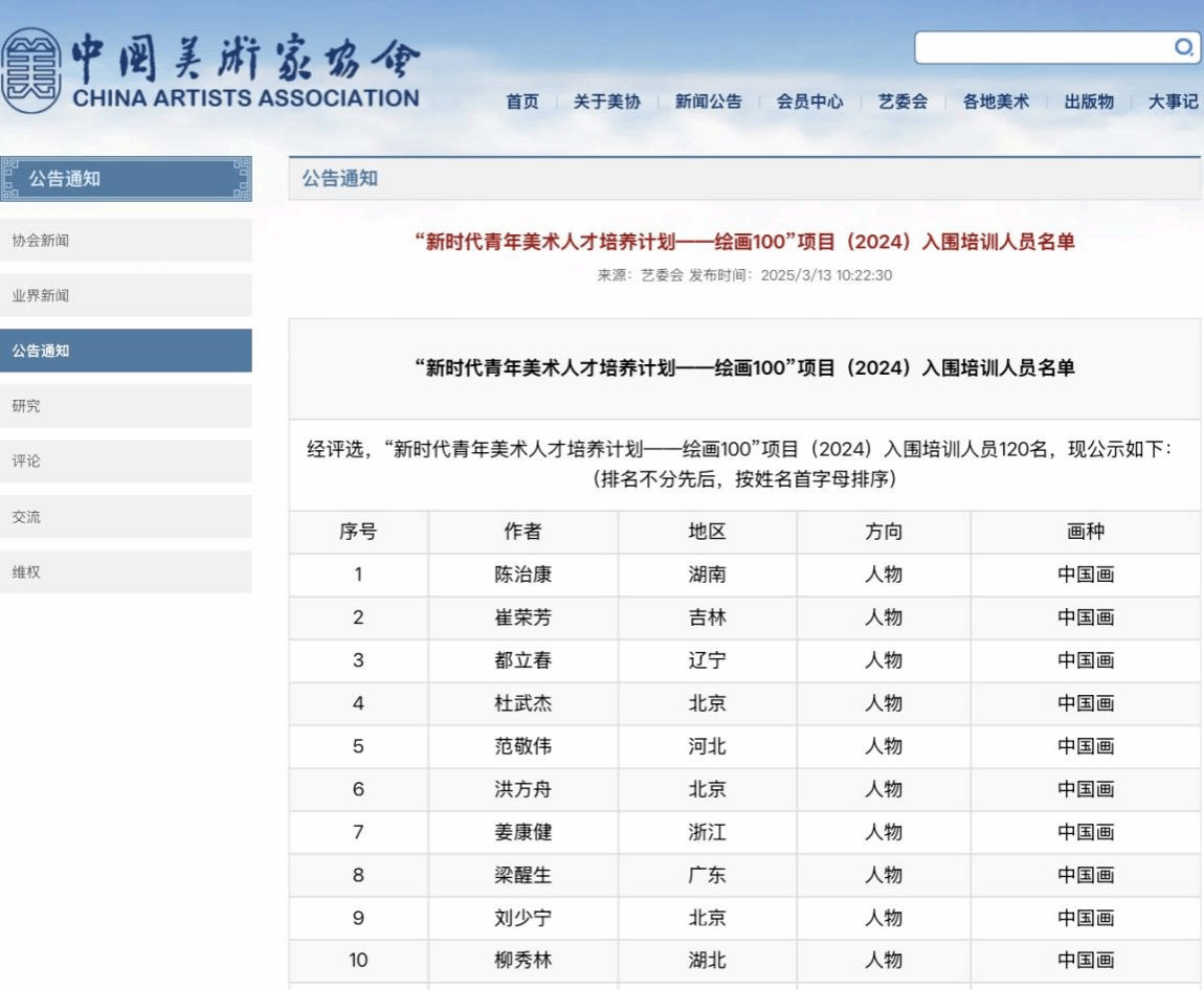 “新时代青年美术人才培养计划——绘画100”项目由中国美术家协会主办,中国文学艺术界联合会作为指导单位,依托中国美术学院组织实施,教学采用导师制形式,包括集中授课、考察研学、创作实践、成果展示等。学员围绕“开放的写意精神”“宽阔的现实主义”等大命题自备创作选题,力求重溯写意精神根旨、构建写意观念形式、深入笔墨语言探索,关注现实世界的生活情境,深挖现实创作主题,淬炼绘画表现技艺。本项目于2024年8月发布启动,在全国范围遴选45周岁以下的从事中国画或油画创作的美术家和美术工作者。经中国美术家协会评审,最终120人入选本项目,其中中国画63人,油画57人,作为发现、培养、推介青年美术人才的“种子工程”,为优秀青年美术家脱颖而出创造条件,为新时代文艺发展提供青年人才支撑。